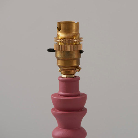 A beautiful wooden turned spindle light, painted satin pink clay. Perfect for classic interiors, featuring a brass B22 switched lamp holder and grey braided fabric flex. Paired with our bright apricot orange 20cm Zigzag shade for a unique, classic look.