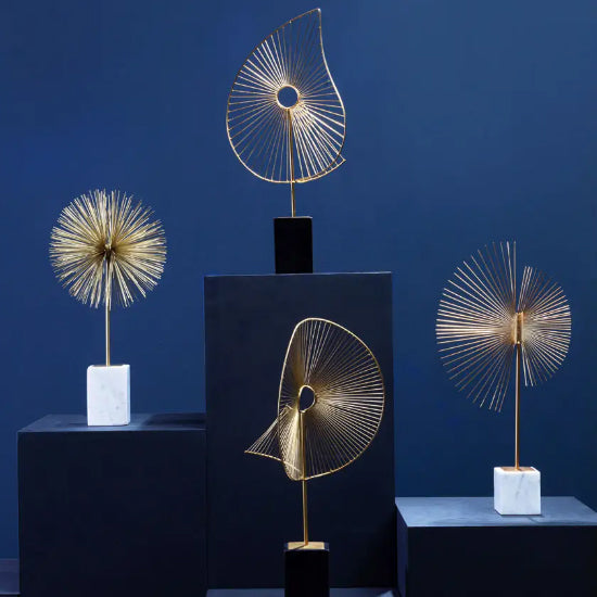 The Mirano sculpture with a series of sleek metal wires in a rich metallic tone will create a modern contemporary statement. The Mirano gold finish iron sculpture creates an elegant droplet shape. The irregular sculpture with intricate sleek metal wires in a luxe finish rests on a black granite base that provides stability.