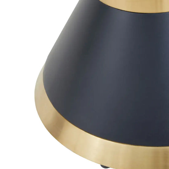 This dining table features a conical black metal sturdy base with a round black faux marble top, complemented with two gold stripes placed.