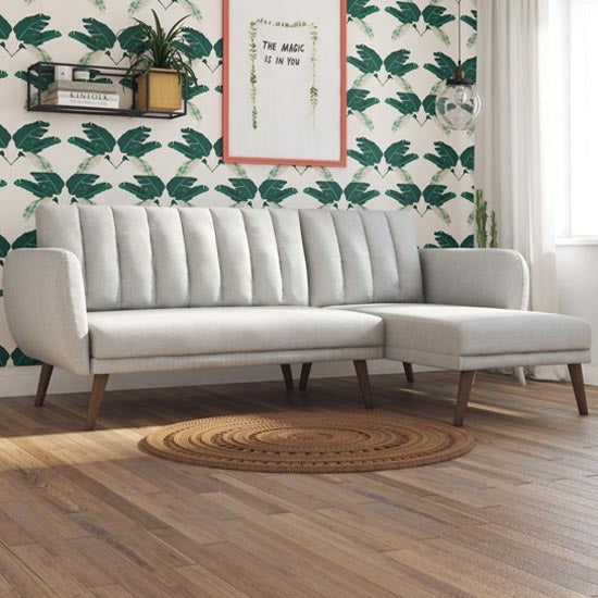 Comfy and compact, the Brittany Sectional Futon Sofa is perfect for any small living space! Add a contemporary flair and a pop of colour to your living room with this modern futon upholstered in rich linen with a ribbed tufted back.