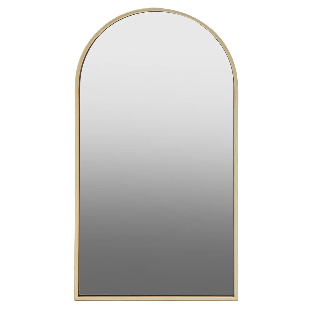 This wall mirror features a sleek frame with an Contemporary arched aesthetic accented in a gold finish. The minimal frame combines clean and rounded lines to create a modern statement.
