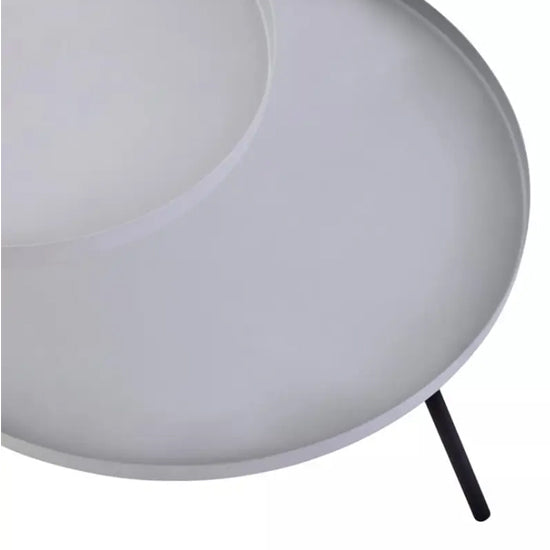 This side table features two rounded grey iron trays supported by sleek, minimalist black iron legs, giving the design a contemporary look. The monochrome colour scheme and angular aesthetic add to its stylish appeal.