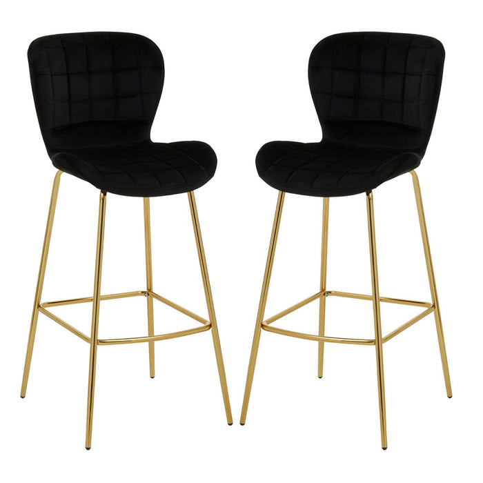 Ideal for pairing with a variety of themes, this bar chair will provide a comfortable seating experience. This bar chair is upholstered in sumptuous black velvet. The quilted seat and backrest of this chair are enhanced by fine stitching. The chair is complete with splayed gold finish legs and footrests, contributing to the clean aesthetic of the modern design.