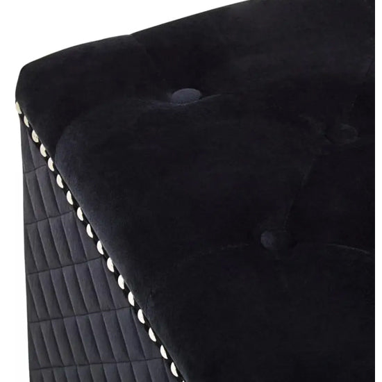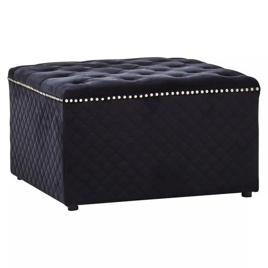Luxuriously padded for comfort, this square Ottoman exudes elegance with black velvet upholstery. This black velvet square Ottoman features button tufting on its seat and intricate stud detailing along the top edge. The sides showcase a striking diagonal tufted pattern, enhancing its visual appeal.